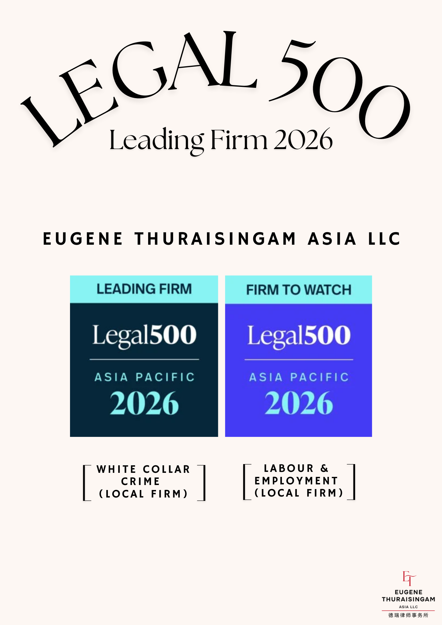 We are delighted to share that Eugene Thuraisingam Asia LLC, formerly known as Eugene Thuraisingam LLP, has been ranked for the fourth consecutive year on Legal 500’s List of leading local firms for White-Collar Crime. In addition, we have also been recognised as a Firm to Watch in Labour and Employment for local firms.
